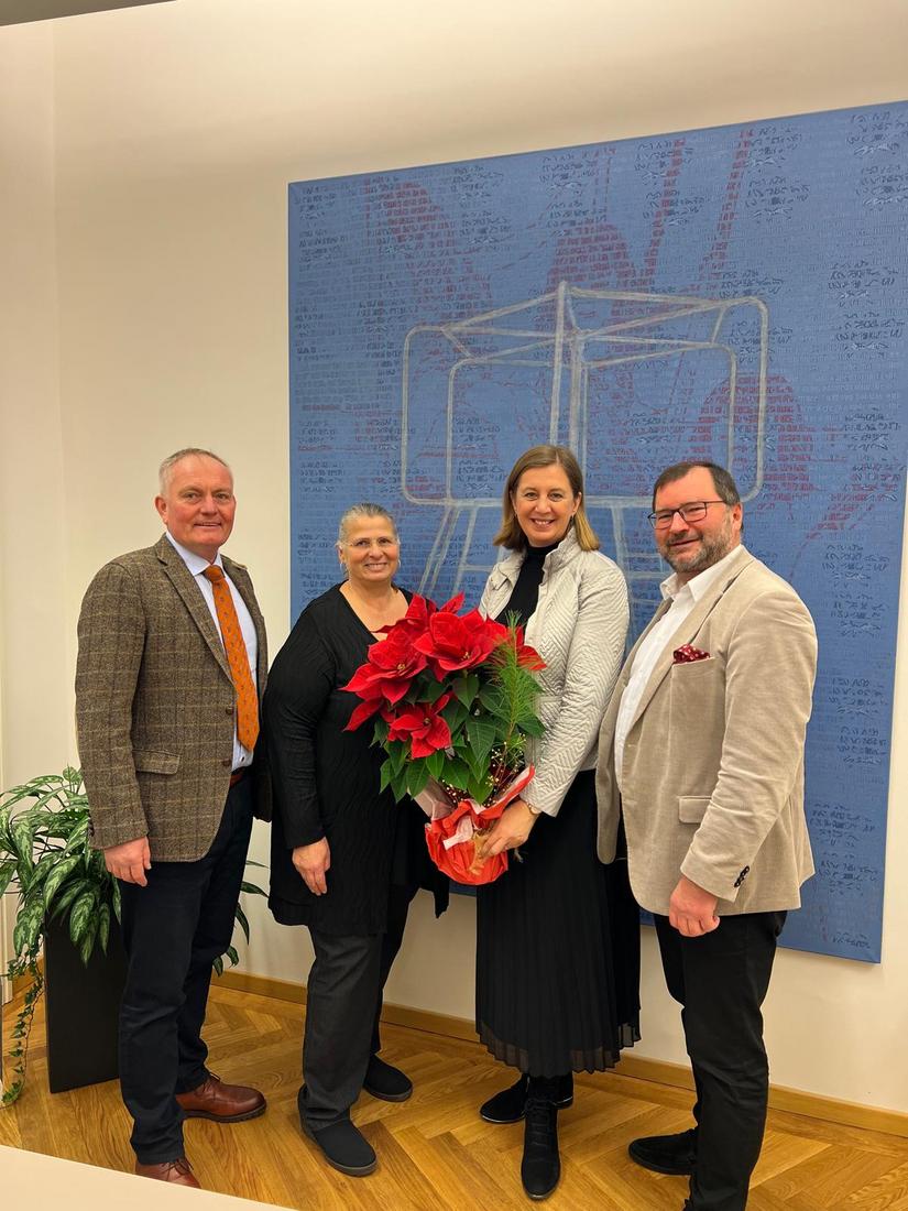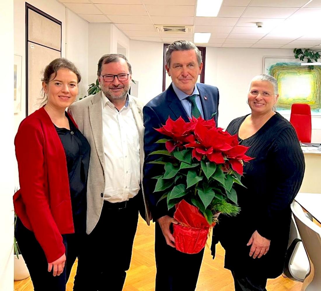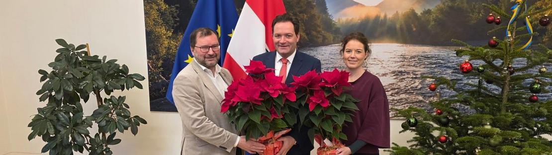 Ebenfalls auf der Besuchsliste von LK-Präsident Bauernbundobmann Walter und der Geschäftsführerin des Bundesverbandes der österreichischen Erwerbsgärtner Dipl.-Ing. Marlies Zahaurek, standen der Bundesminister für Land- und Forstwirtschaft, Klima- und Umweltschutz, Regionen und Wasserwirtschaft, Norbert Totschnig, und die Staatssekretärin im Bundesministerium für Wirtschaft, Energie und Tourismus, Mag.a Elisabeth Zehetner. Auch hier überbrachten die vorweihnachtlichen Boten aus Wien einen Blumengruß in Form eines prachtvollen Weihnachtssterns.