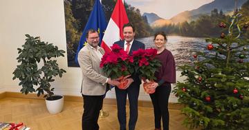 Vorweihnachtliche Grüße von den Wiener Gärtnerinnen und Gärtnern überbrachten an Mitglieder der Bundesregierung der Wiener LK-Präsident Bauernbundobmann Norbert Walter und die Obfrau der Wiener Gärtnerinnen und Gärtner und Präsidentin des Bundesverbandes der Österreichischen Gärtner, Ulrike Jezik-Osterbauer. Die beiden besuchten, begleitet vom Geschäftsführer der Wiener Landesgartenbauvereinigung Alexander Jezik-Osterbauer, den Bundesminister für Innovation, Mobilität und Infrastruktur, Peter Hanke, und die Bundesministerin für Europa, Integration und Familie im Bundeskanzleramt, Claudia Plakolm. Walter und Jezik-Osterbauer nutzten die Gelegenheit, um die jeweiligen Regierungsmitglieder über die Situation des Gartenbaus in der Bundeshauptstadt zu informieren.