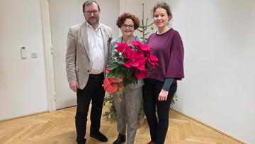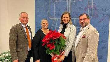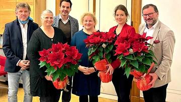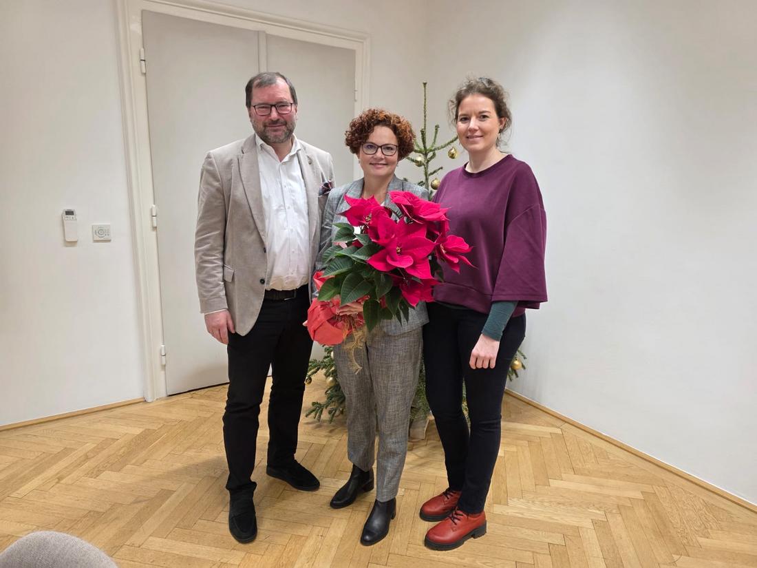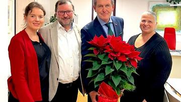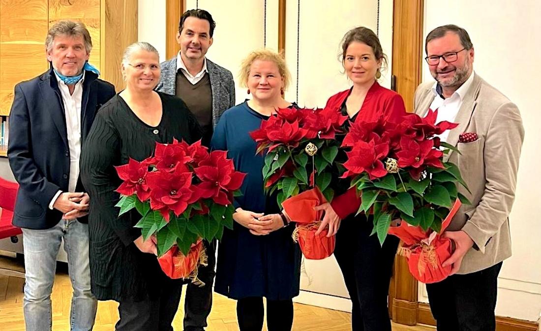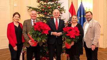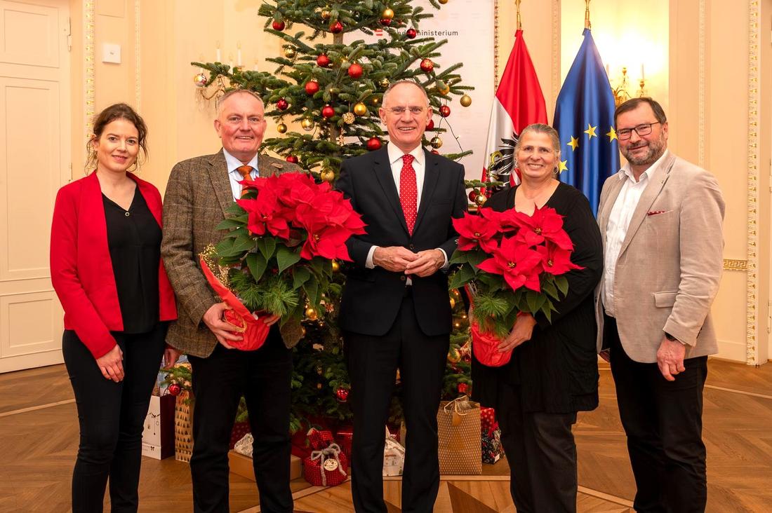 Einen weiteren weihnachtlichen Blumengruß der Wiener Stadtlandwirtschaft unter der Leitung von Bauernbundobmann LK-Präsident Norbert Walter, dem Vorsitzenden des LK-Fachausschusses für Weinbau, Matthias Kierlinger, der Geschäftsführerin des Bundesverbandes der österreichischen Erwerbsgärtner Marlies Zahaurek und der Obfrau der Wiener Gärtnerinnen und Gärtner und Präsidentin des Bundesverbandes der Österreichischen Gärtner, Ulrike Jezik-Osterbauer, erhielt die Bundesministerin für Soziales, Gesundheit, Pflege und Konsumentenschutz, Korinna Schumann (Bild Mitte).