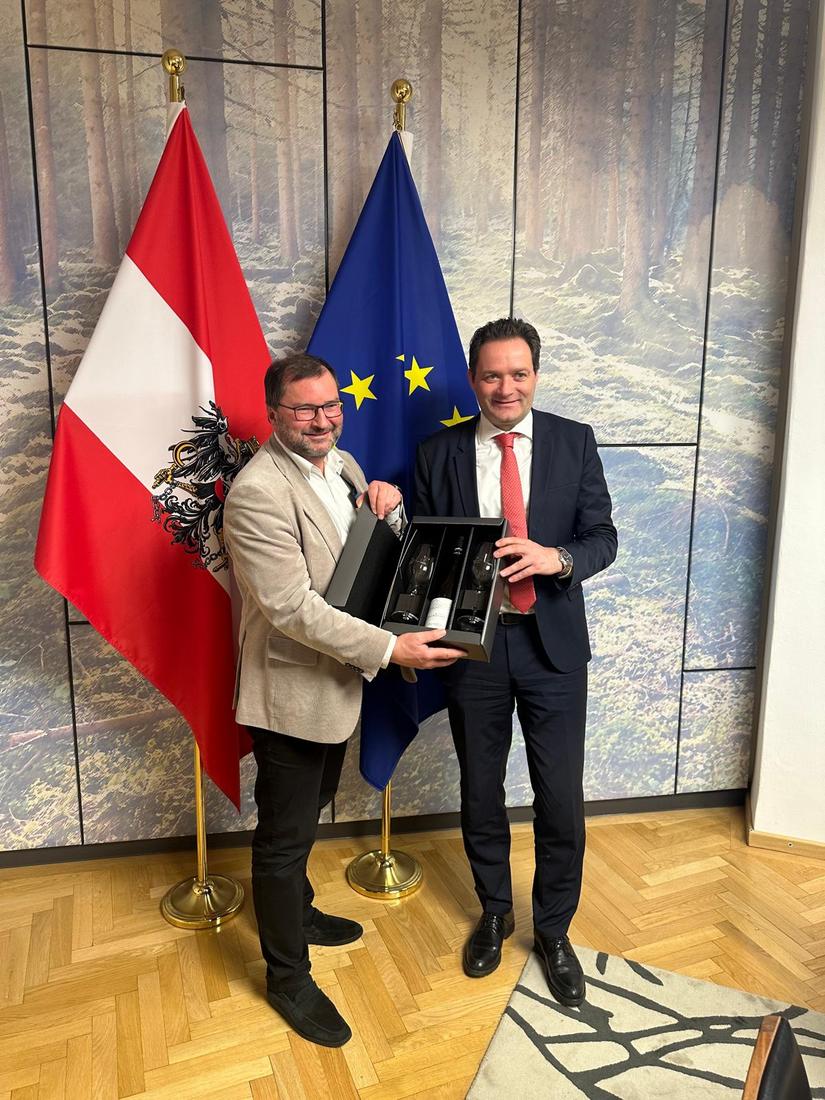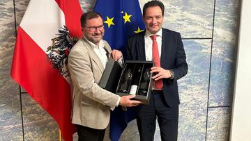 Einen weihnachtlichen Gruß der besonderen Art konnte LK-Präsident Walter an Landwirtschafts- und Umweltminister Totschnig überreichen. Es war dies eine Exklusivausgabe von Wein des Weingutes Walter und ein Set spezieller Gläser des Weingutes und der Dompfarre St. Stephan.