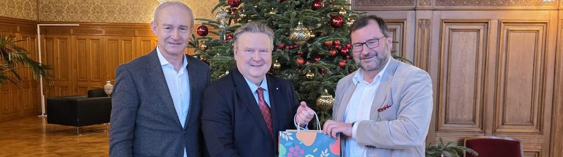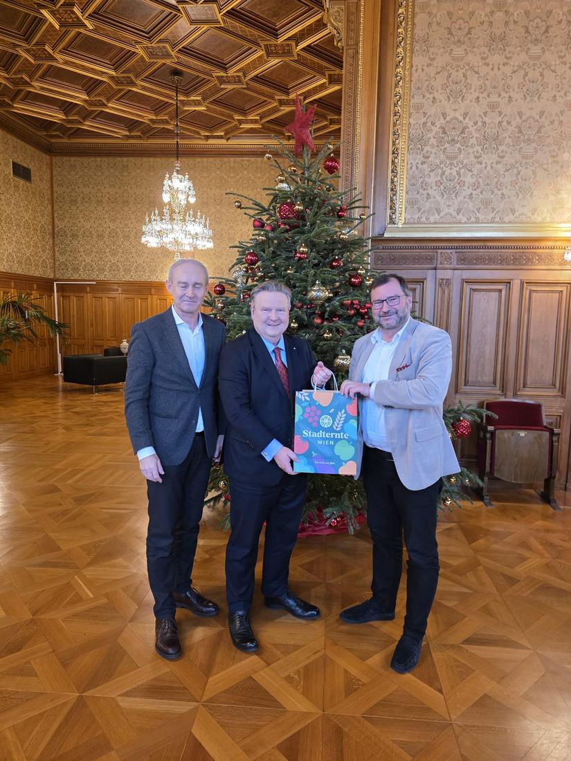 Der Präsident der LK Wien, Bauernbundobmann Norbert Walter, und der Kammerdirektor der LK Wien, Robert Fitzthum, überbrachten dem Wiener Stadtoberhaupt, Bürgermeister Michael Ludwig, Weihnachtsgrüße der Landwirtschaftskammer Wien in Form einer Auswahl von Stadternte-Produkten der Wiener Stadtlandwirtschaft.