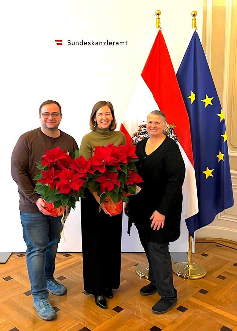 Vorweihnachtliche Grüße von den Wiener Gärtnerinnen und Gärtnern überbrachten an Mitglieder der Bundesregierung der Wiener LK-Präsident Bauernbundobmann Norbert Walter und die Obfrau der Wiener Gärtnerinnen und Gärtner und Präsidentin des Bundesverbandes der Österreichischen Gärtner, Ulrike Jezik-Osterbauer. Die beiden besuchten, begleitet vom Geschäftsführer der Wiener Landesgartenbauvereinigung Alexander Jezik-Osterbauer, den Bundesminister für Innovation, Mobilität und Infrastruktur, Peter Hanke, und die Bundesministerin für Europa, Integration und Familie im Bundeskanzleramt, Claudia Plakolm. Walter und Jezik-Osterbauer nutzten die Gelegenheit, um die jeweiligen Regierungsmitglieder über die Situation des Gartenbaus in der Bundeshauptstadt zu informieren.