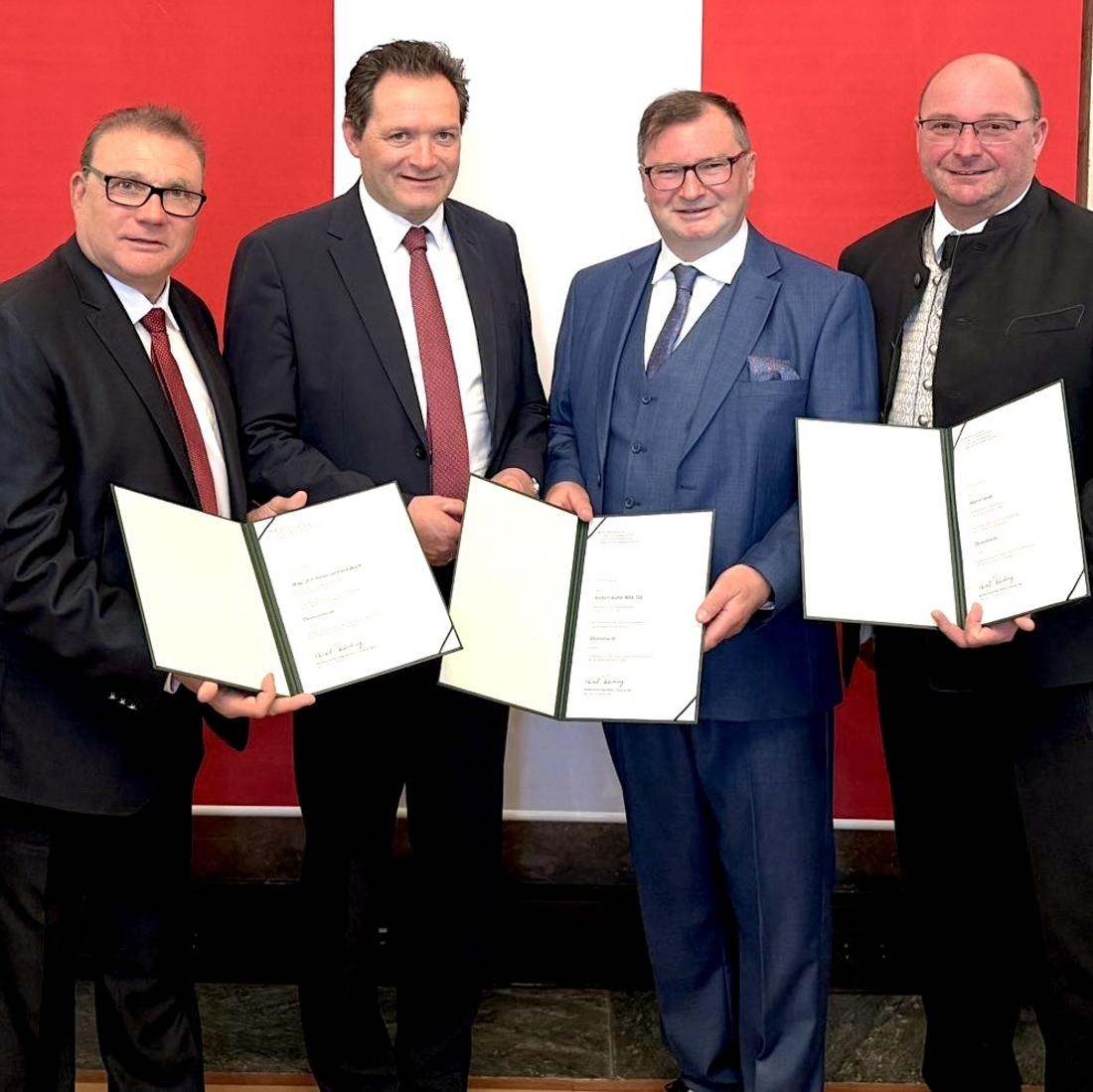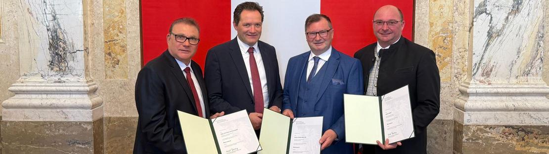 Die Landwirtschaftskammer Wien freut sich, seit 24. April 2026 drei neue Ökonomieräte in ihren Reihen zu haben: Es sind dies der Präsident der LK Wien, Bauernbund-Obmann Norbert Walter, LK-Vizepräsident und Gemeinderat Martin Flicker und der Winzer, Heurigenwirt und Weinbauvereins-Obmann Peter Wolff. Die drei Ausgezeichneten erhielten das Ernennungsdekret für den Berufstitel „Ökonomierat“ in Anwesenheit höchster LK-Wien-Funktionäre und -Mitarbeiter aus den Händen von Landwirtschaftsminister Norbert Totschnig.