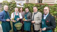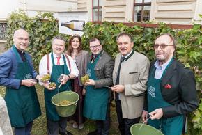 Der Wiener Bauernbundobmann Norbert Walter, Bürgermeister Dr. Michael Ludwig und Dompfarrer Toni Faber beendeten die Weinlese mit der Weinlese am Schwarzenbergplatz.